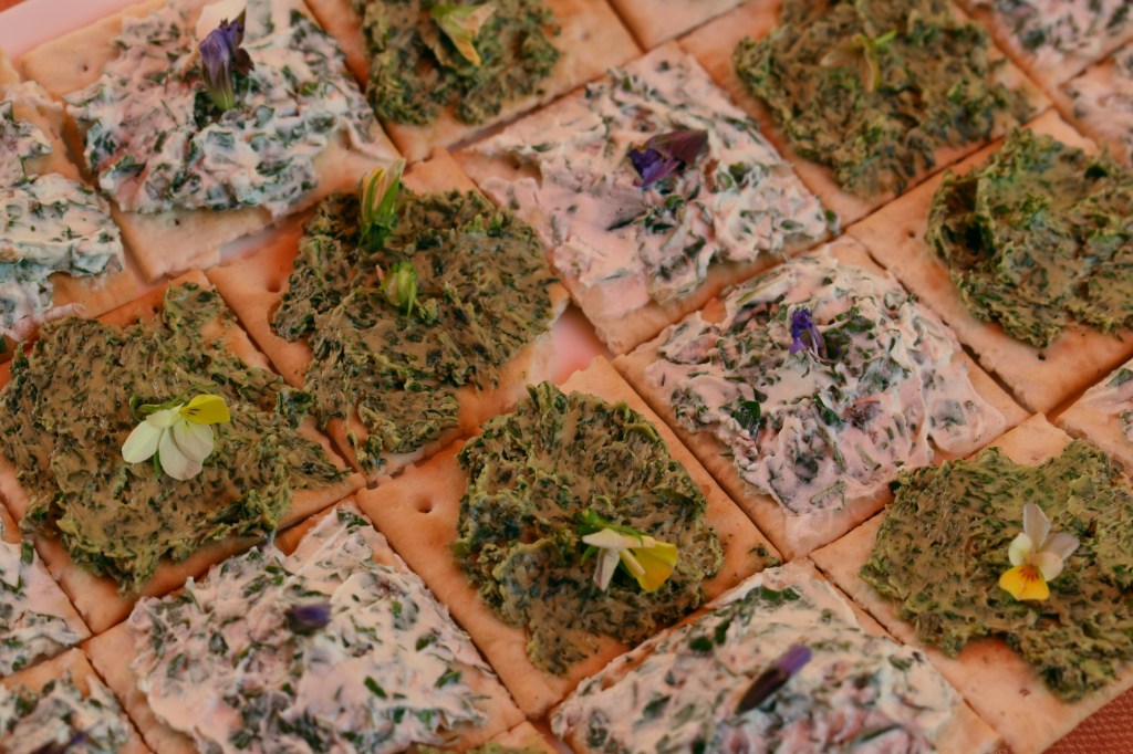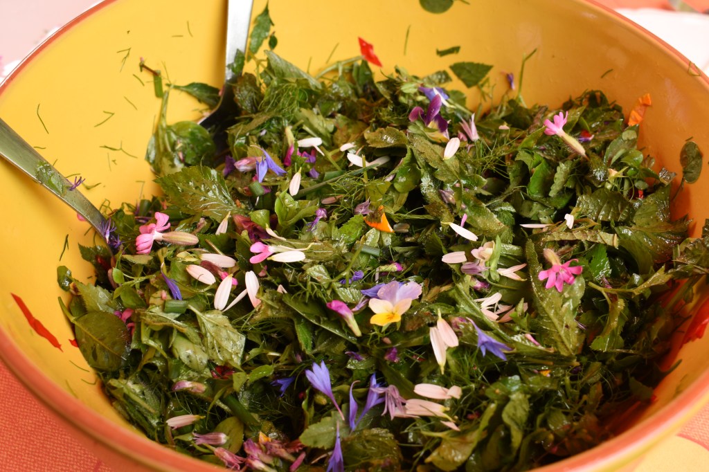 Cueillir diverses plantes sauvages : feuilles de bourrache, orties, lierre terrestre, aegopode, chénopode, feuilles de consoude, gaillet, feuilles d’oxalis, feuilles de plantain, feuilles et fleurs de trèfle, feuilles de pimprenelle, feuilles de mouron des oiseaux, feuilles de galinsoga, … Pour décorer, utiliser des fleurs de pensée, de campanule, de marguerites (pétales), de géranium Robert, …
