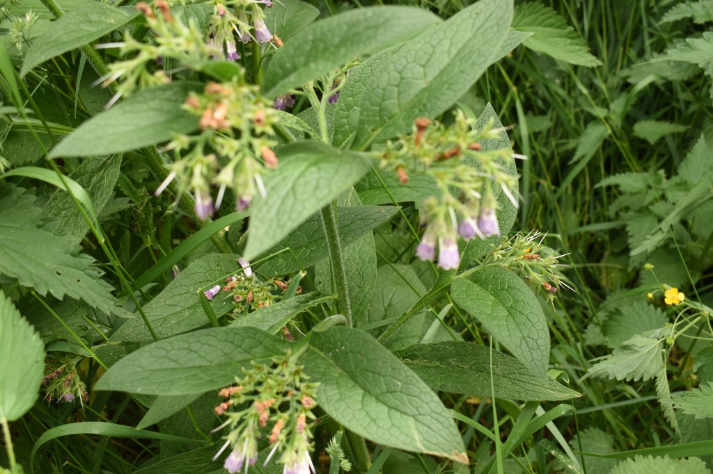 Feuilles de consoude dos à dosPlante de consoude en fleursFeuilles de digitale, toxiques